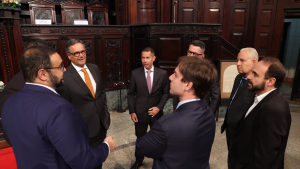 A mesa principal foi composta pelo deputado Jorge Felippe Neto, pelo homenageado Pedro Carsalade, pelo presidente da ABADI Rafael Thomé, pelo diretor de Condomínios e Locação Marcelo Borges, pelo diretor jurídico Roberto Bigler e pelo conselheiro nato da ABADI, George Eduardo Masset.